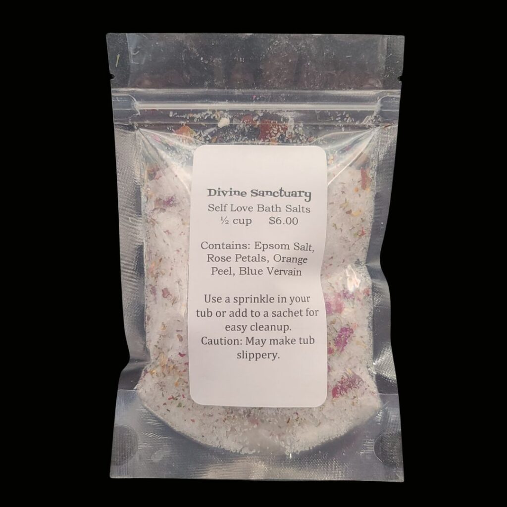 Self love bath salts contain epsom salt and is blended with rose petals, orange peel and blue vevain.