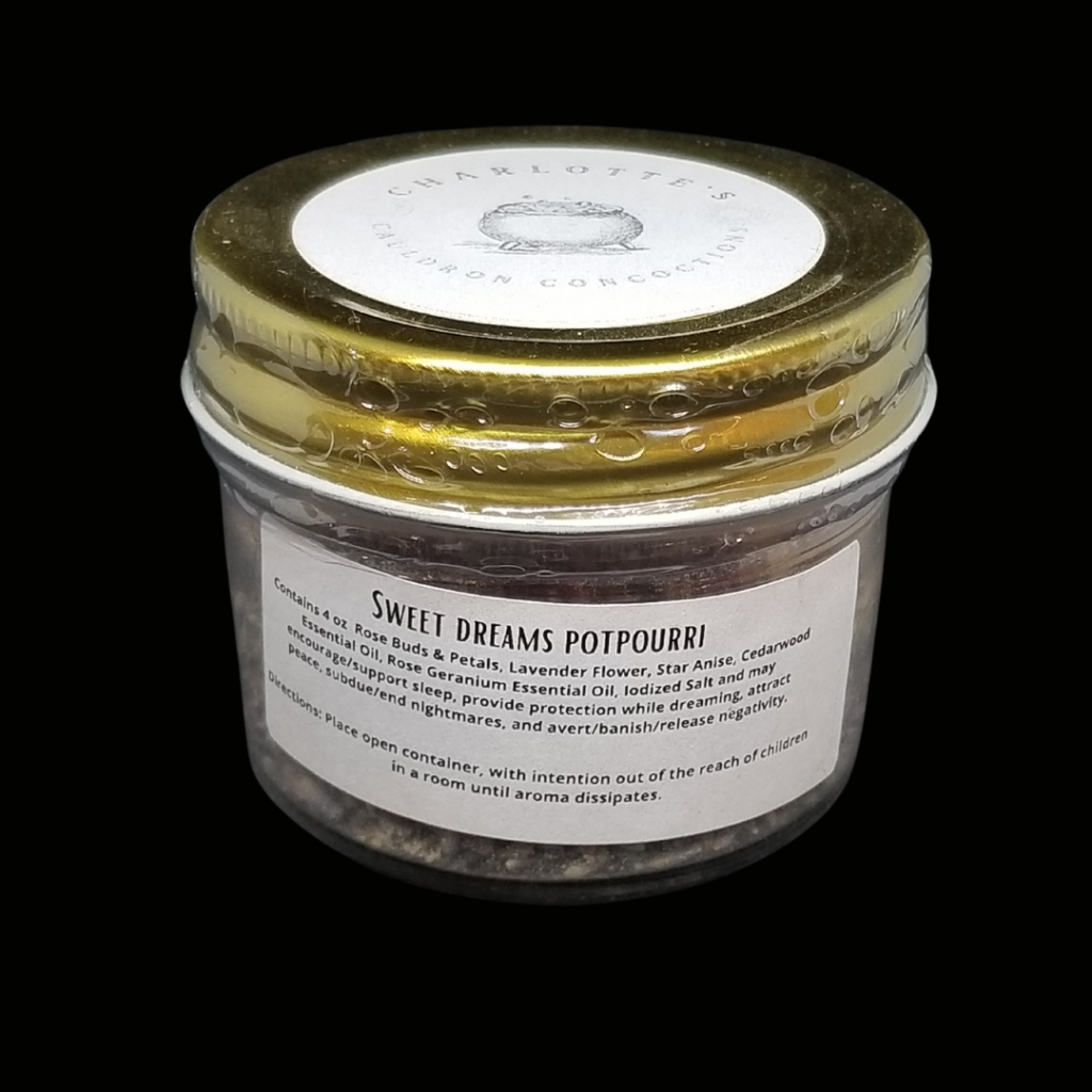 4 ounces sweet dreams potpourri contains rose buds and petals, lavender flower, star anise pods, cedarwood essential oil, rose geranium essential oil, and iodized salt. It may encourage and support sleep, provide protection while dreaming, attract peace, subdue or end nightmares and avert/banish/release negativity.