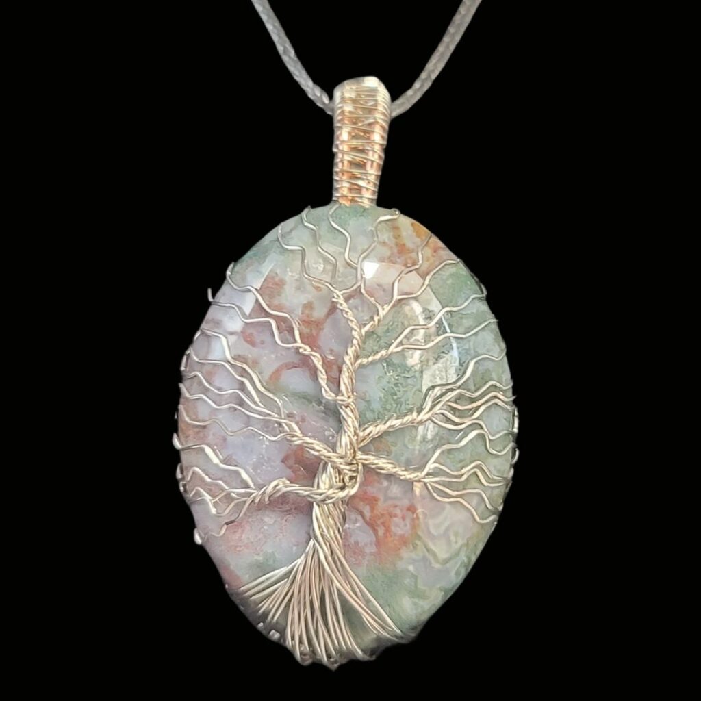 Moss Agate stone wrapped with a silver tree of life. All tree of life pendants will come with an adjustable cord. This large tree of life pendant is approximately 30mm x 40mm.