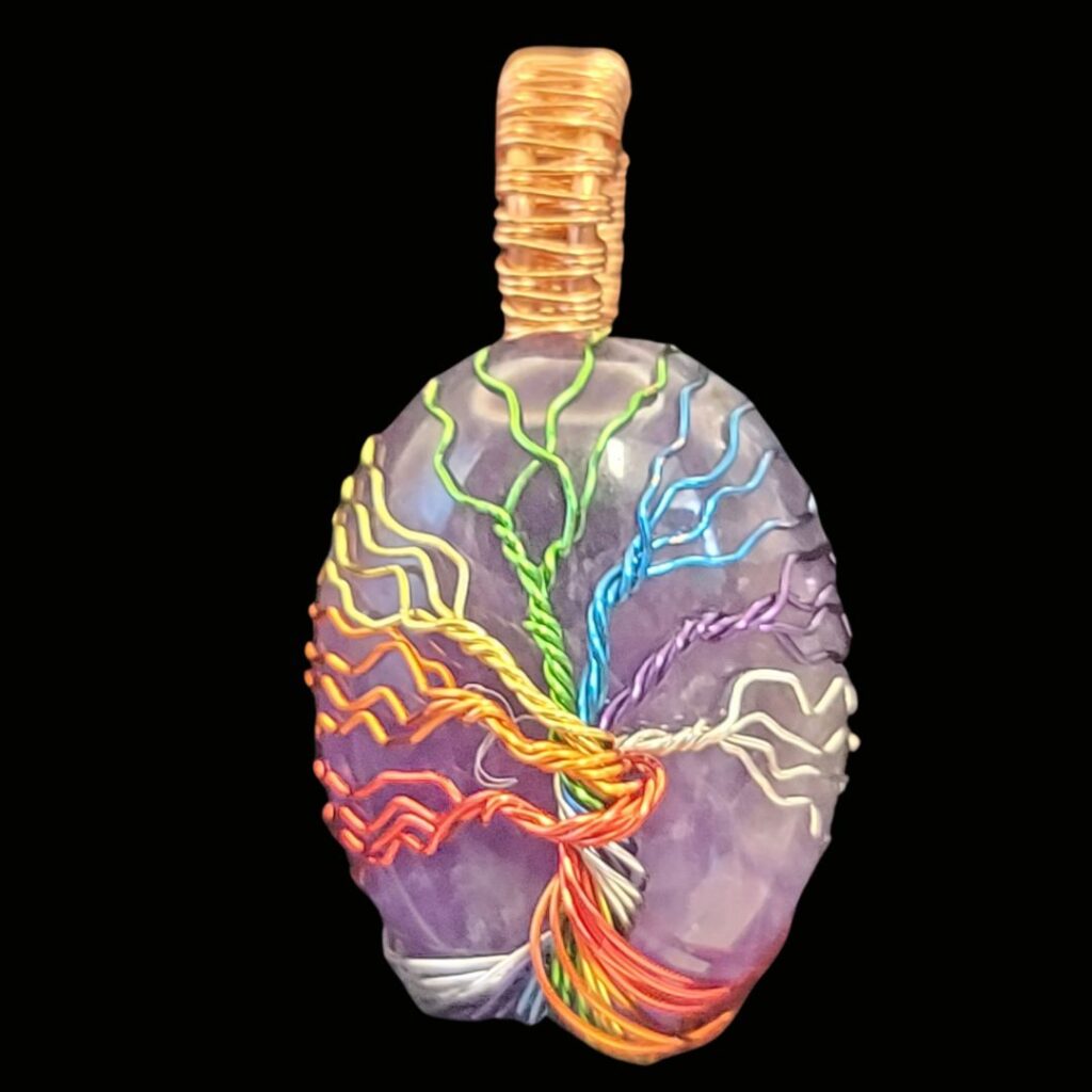 Amethyst cabochon stone wrapped with a chakra tree of life. All tree of life pendants will come with an adjustable cord. The cabochons are 22mm x 30mm.
