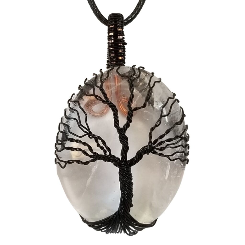 Clear Quartz stone wrapped with a black tree of life. All tree of life pendants will come with an adjustable cord. The large tree of life pendants are approximately 35mm x 45mm.