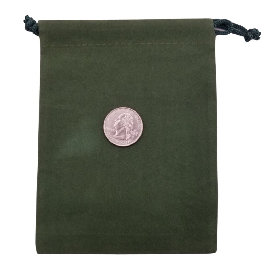 4″ x 5.5″ green velveteen bag. Quarter shown for size comparison and is not included.
