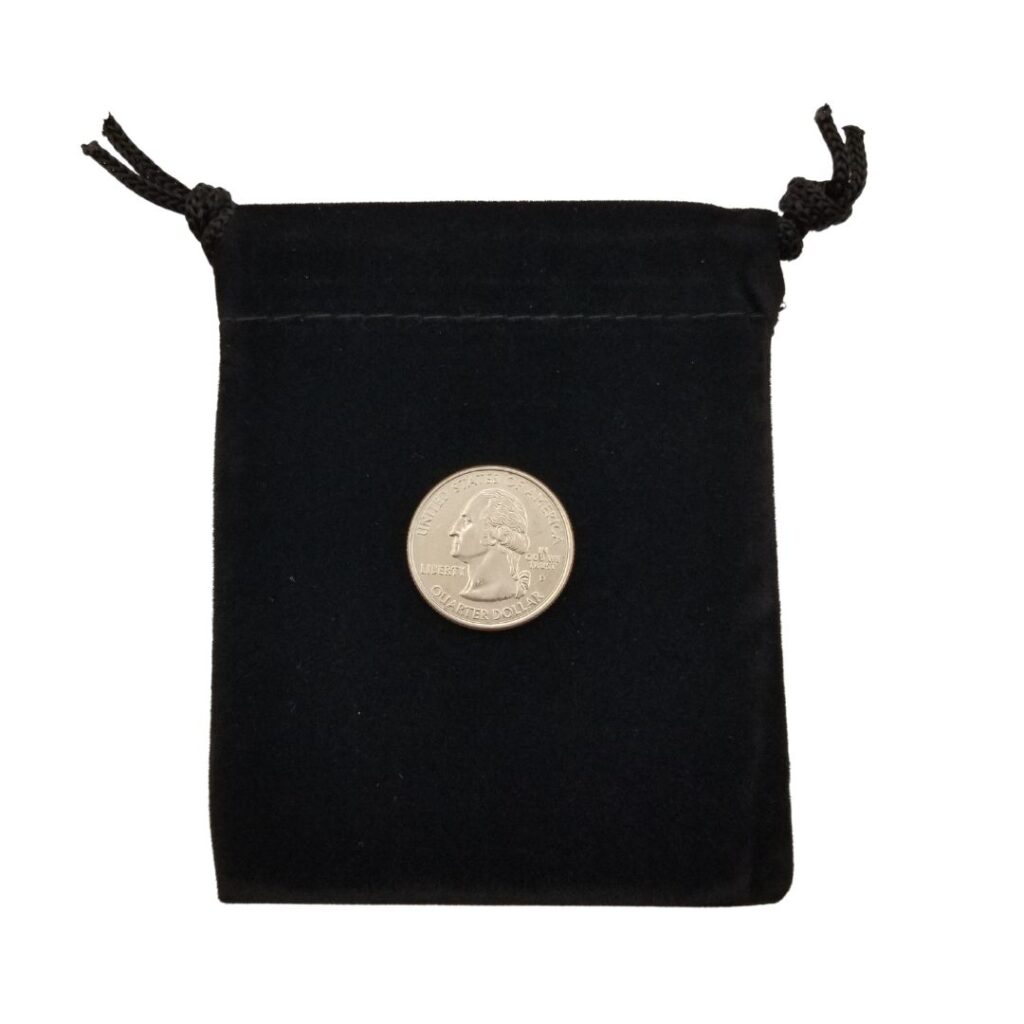3″ x 4.5″ black velveteen bag. Quarter shown for size comparison and is not included.