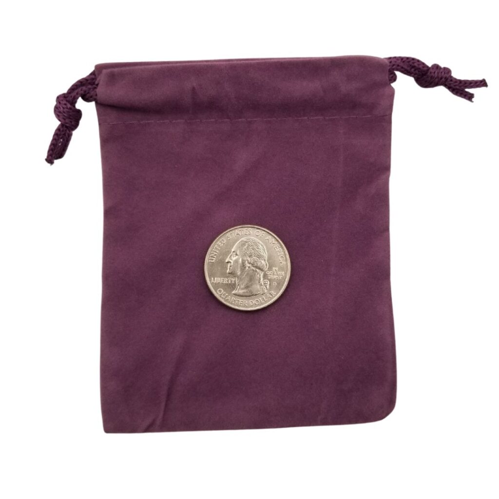 3″ x 4.5″ purple velveteen bag. Quarter shown for size comparison and is not included.