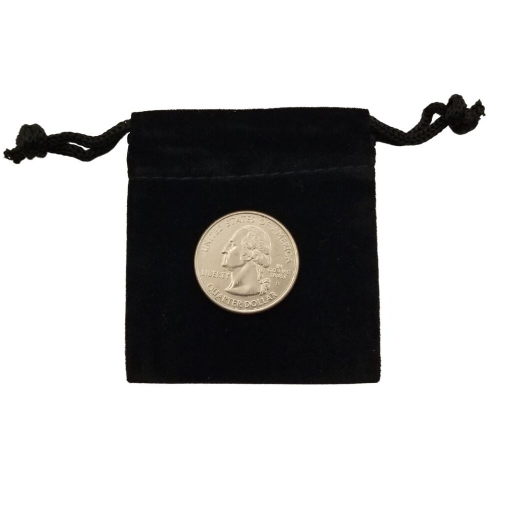 2.5″ x 2.5″ black velveteen bag. Quarter shown for size comparison and is not included.