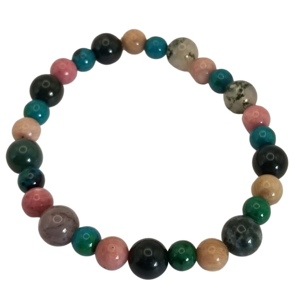 Venus Retrograde Bracelet made with rhodonite, chrysocolla and green moss agate beads, approximately 8 inches.